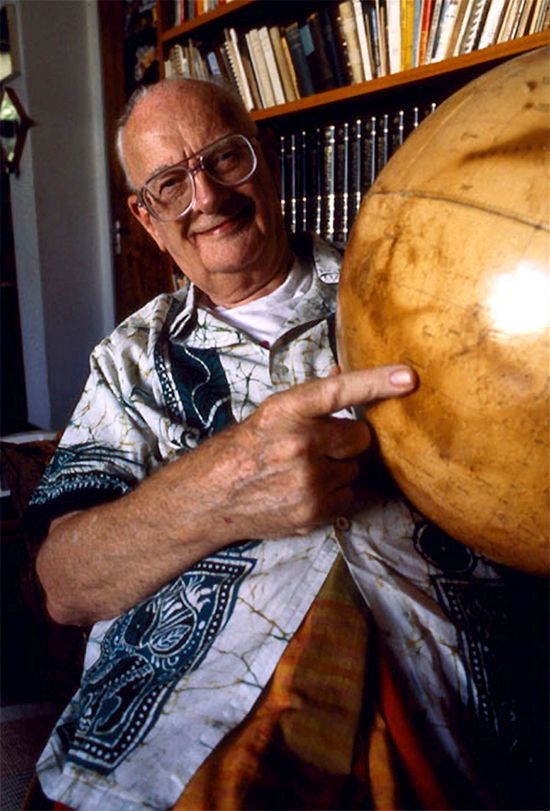 Arthur Clarke at his home, holding a globe of Mars. Picture: copyright Jeff Greenwald.