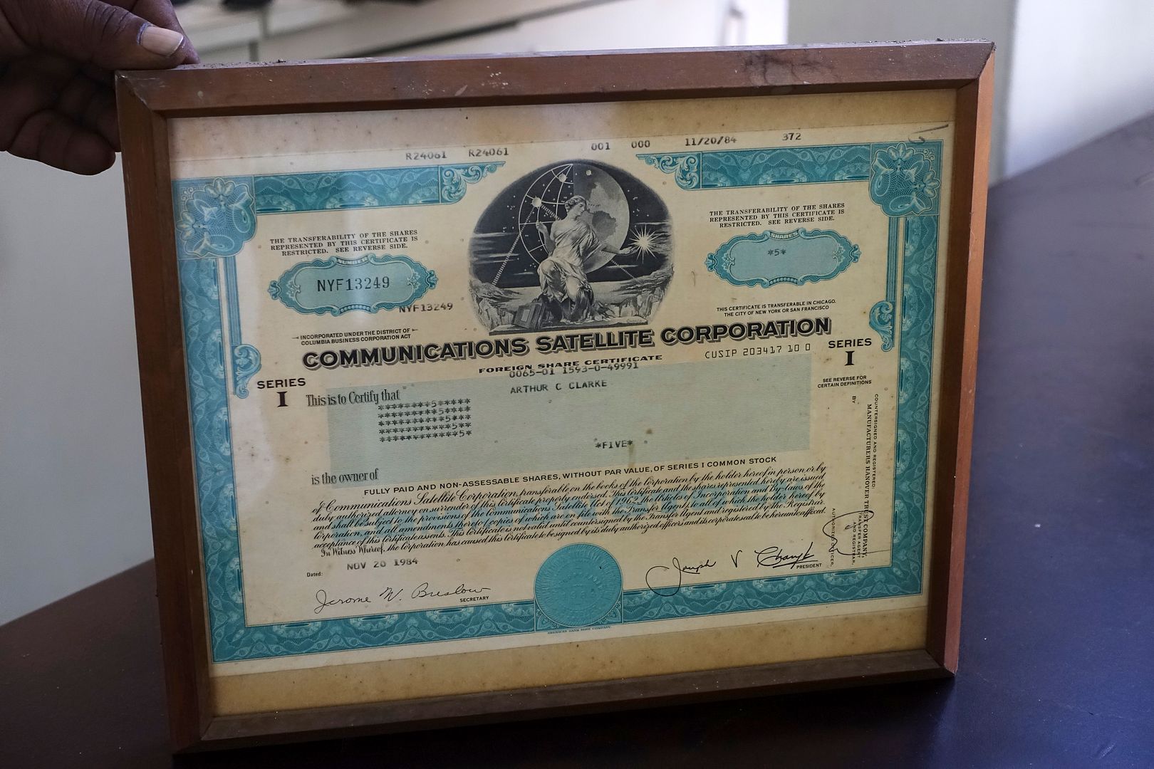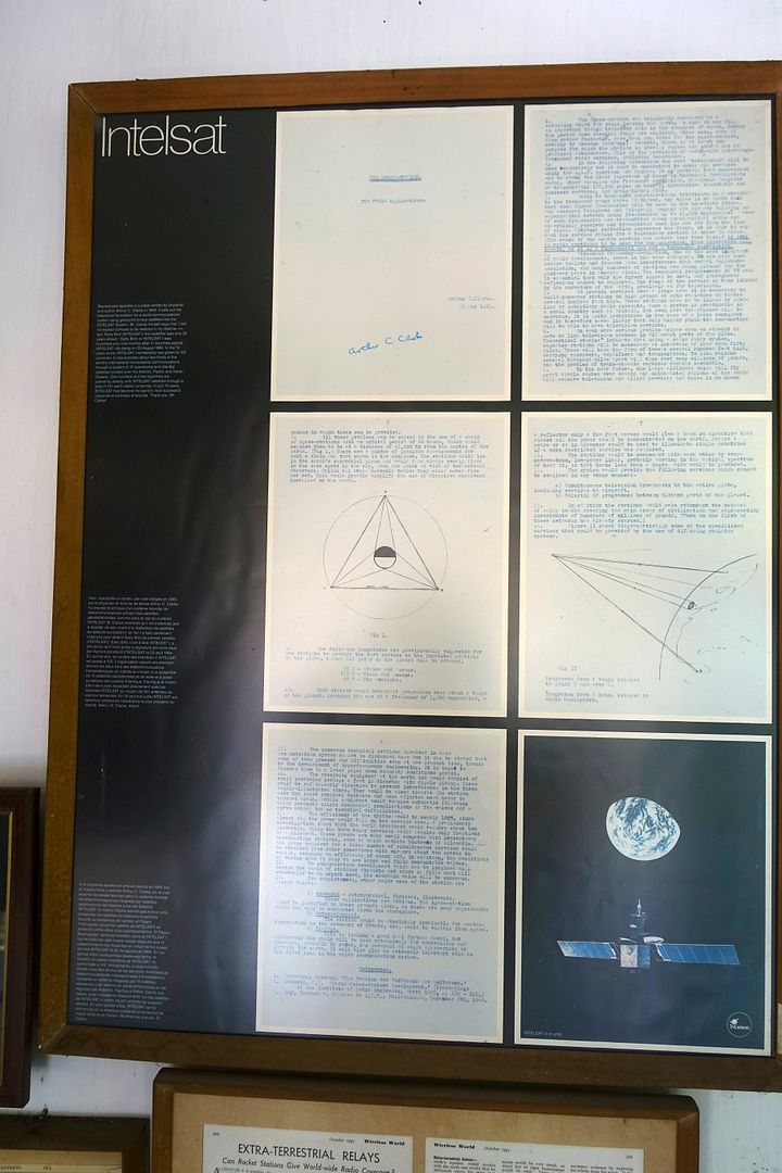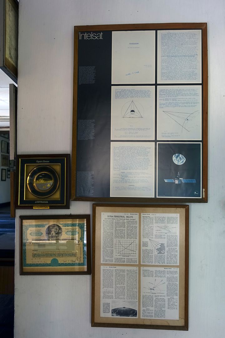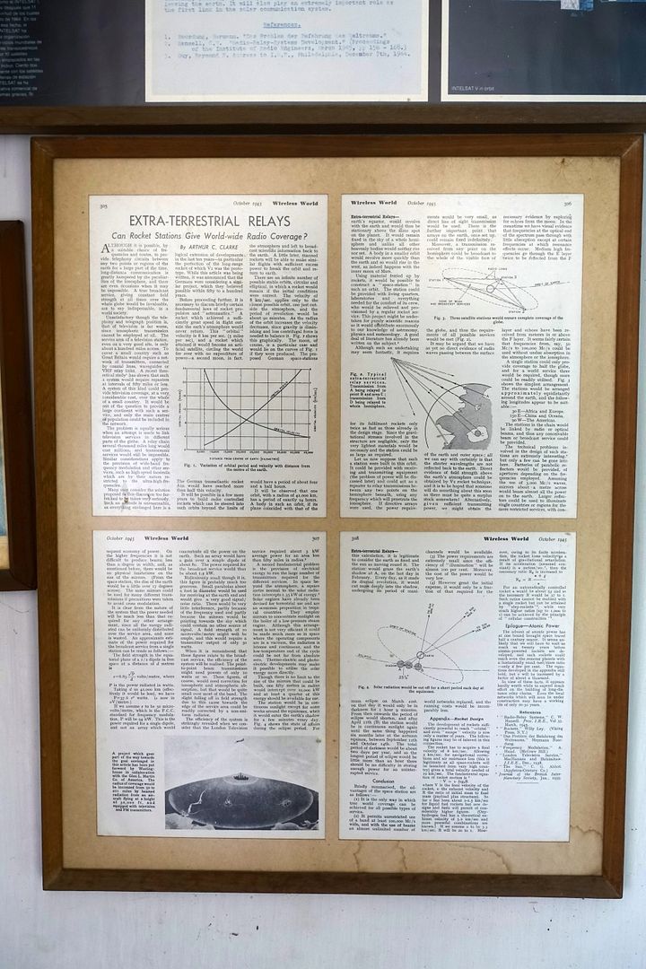 At the top of the stairs, surprise, the original 1945 text of Arthur C. Clarke depicting his concept of a series of geo-stationery satellites, as well as the certificate of five shares of the "Communications Satellite Corporation".